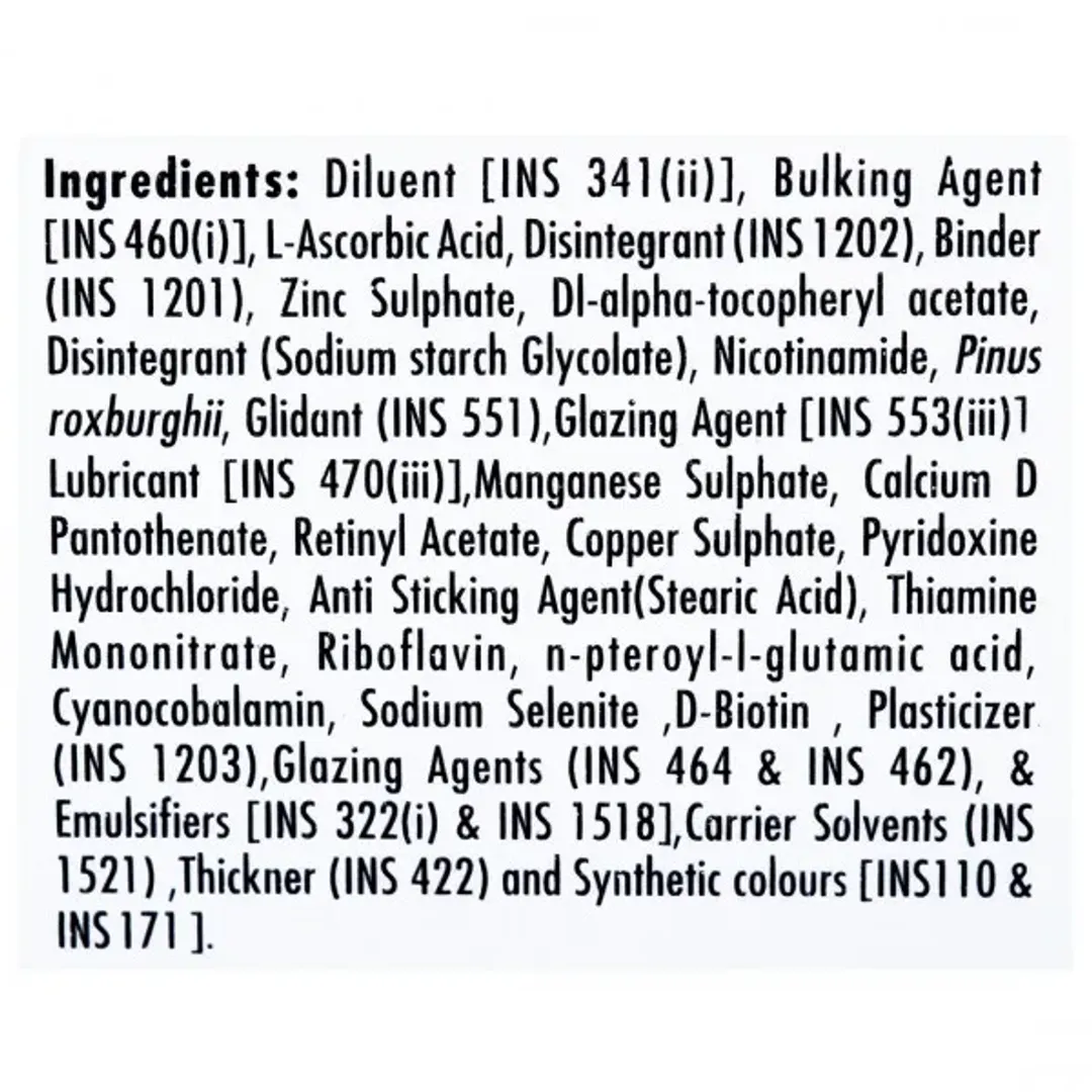 Calcium Pantothenate, Vitamin C, Vitamin B12, Folic Acid, Vitamin B1, Vitamin B6, Vitamin B2, Niacinamide, Biotin